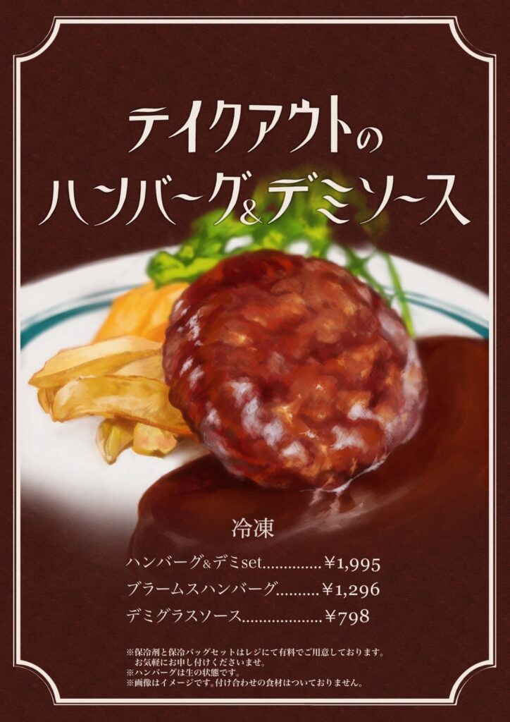 冷凍でお持ち帰りいただける「ブラームスハンバーグ」と「デミグラスソース」が店頭にて好評販売中です!